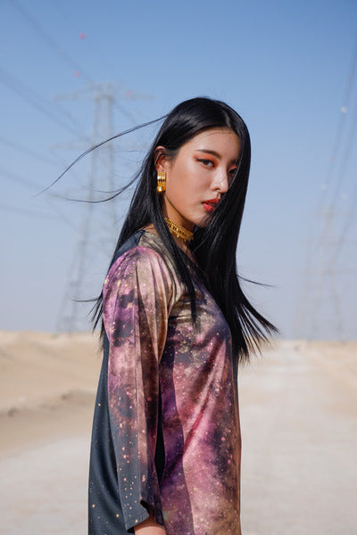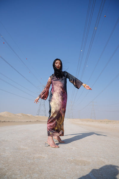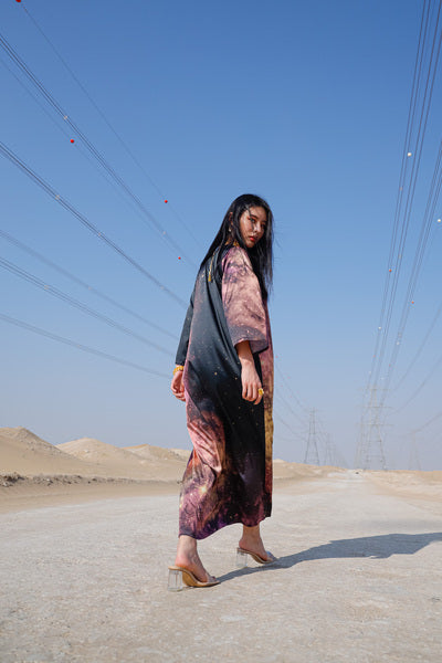 print on the classic Jalabiya. Minimal long sleeve kaftan.